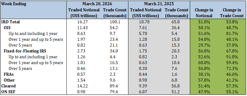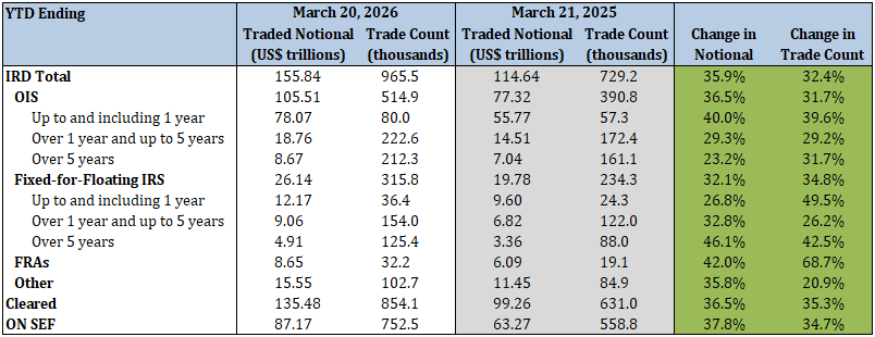 - Total IRD traded notional and trade count increased by 35.9% and 32.4%, respectively