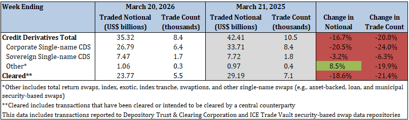 - Corporate single-name CDS traded notional and trade count decreased by 5.3% and 8.5%, respectively