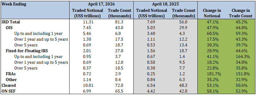 - Total IRD traded notional and trade count increased by 25.4% and 26.0%, respectively