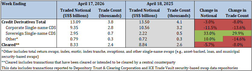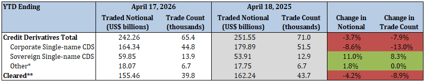 - Corporate single-name CDS traded notional and trade count decreased by 9.2% and 14.0%, respectively