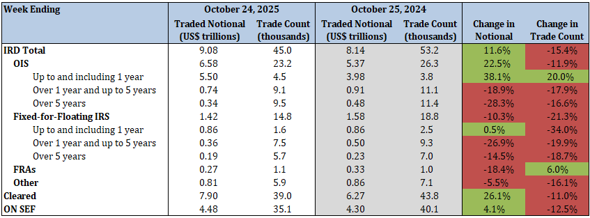 - Total IRD traded notional and trade count increased by 43.6% and 20.7%, respectively