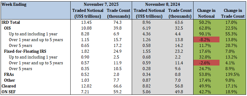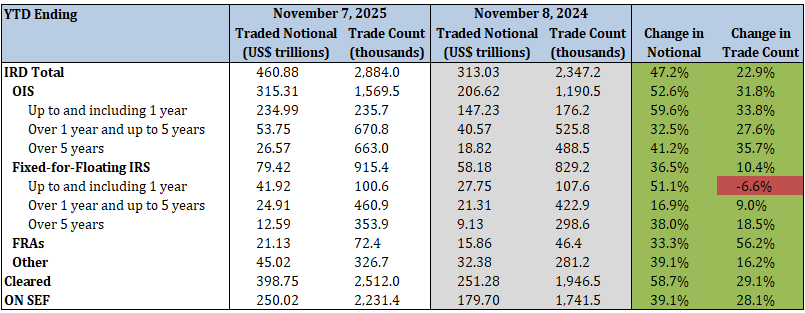 - Total IRD traded notional and trade count increased by 47.2% and 22.9%, respectively