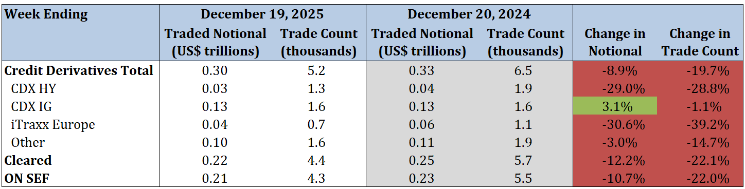 - Corporate single-name CDS traded notional and trade count decreased by 4.1% and 12.5%, respectively