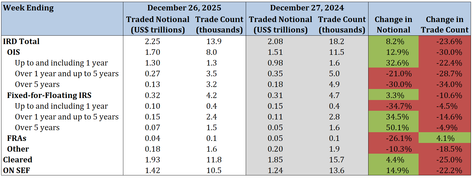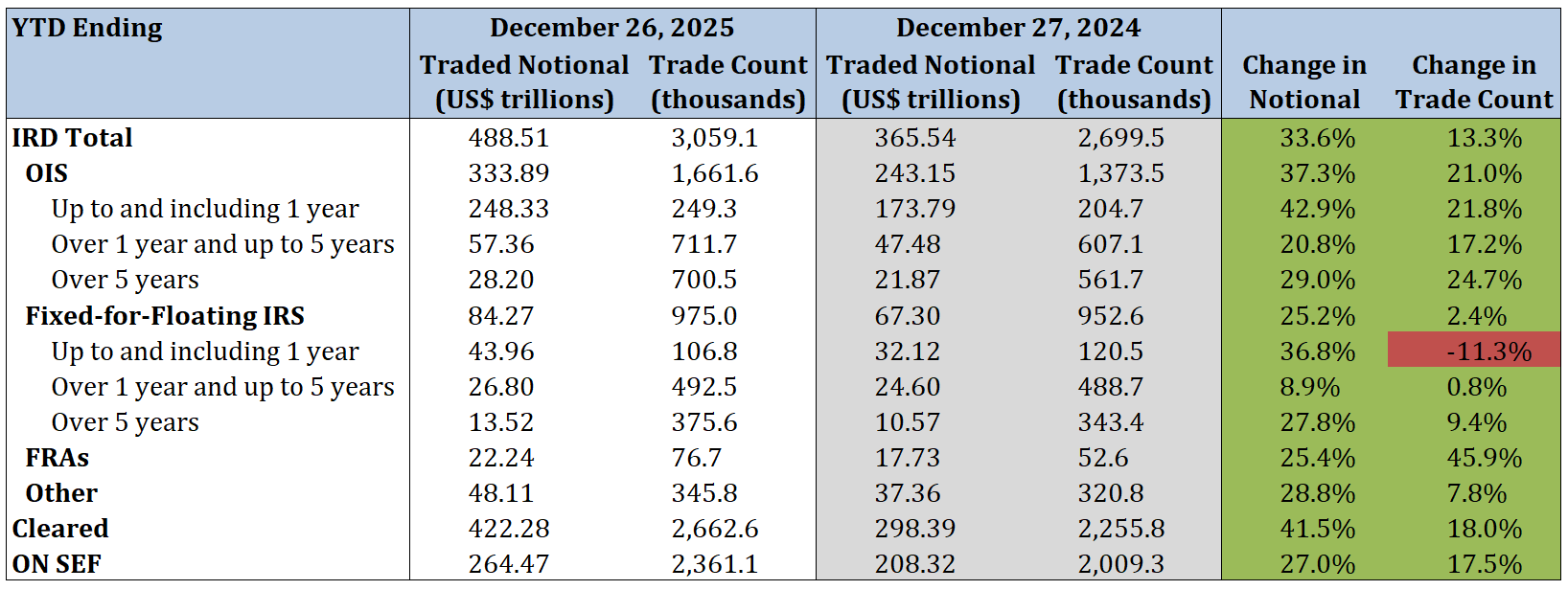 - Total IRD traded notional and trade count increased by 33.6% and 13.3%, respectively