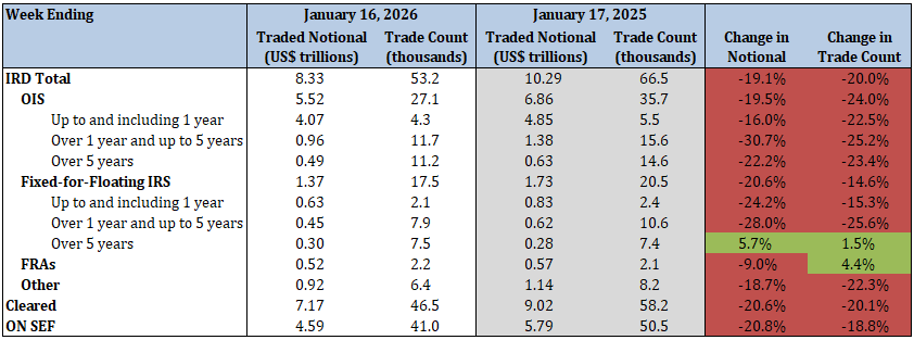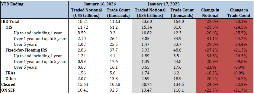 - Total IRD traded notional and trade count decreased by 22.8% and 23.1%, respectively