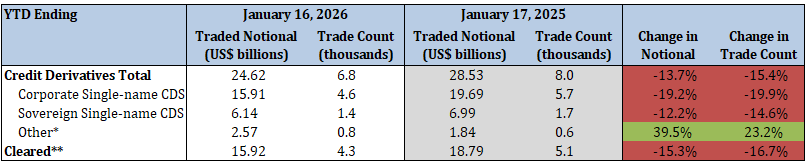 - Sovereign single-name CDS traded notional and trade count decreased by 12.2% and 14.6%, respectively