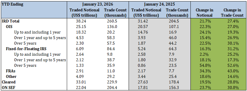 - Total IRD traded notional and trade count increased by 21.7% and 27.4%, respectively
