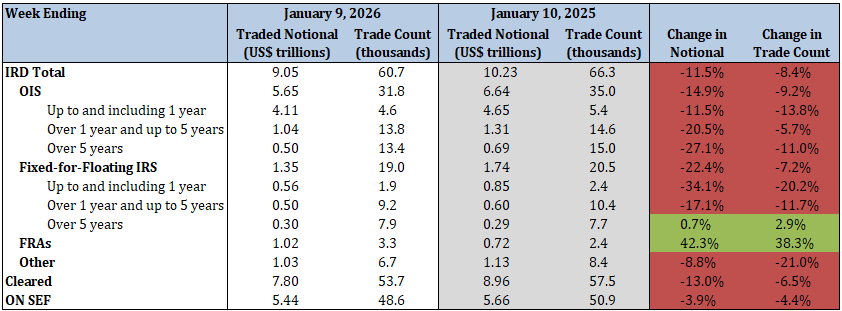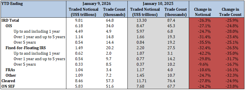 - Total IRD traded notional and trade count decreased by 26.3% and 25.9%, respectively