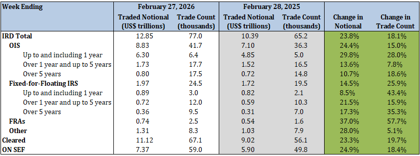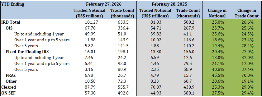 - Total IRD traded notional and trade count increased by 25.0% and 26.6%, respectively