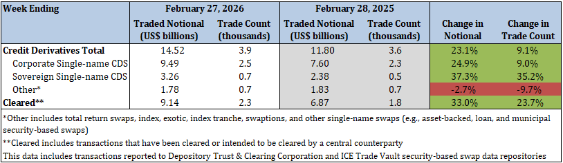 - Sovereign single-name CDS traded notional increased by 2.6%, while trade count decreased by 2.2%