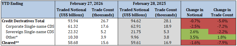 - Corporate single-name CDS traded notional and trade count decreased by 2.5% and 7.2%, respectively