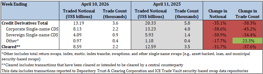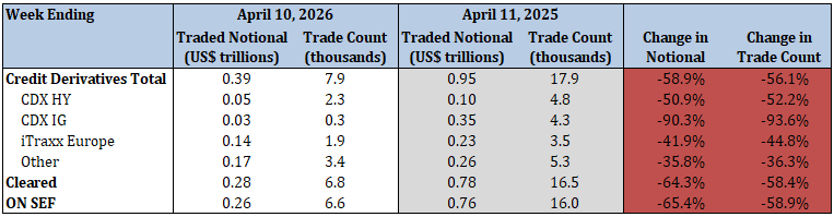 - Corporate single-name CDS traded notional and trade count decreased by 9.2% and 14.0%, respectively