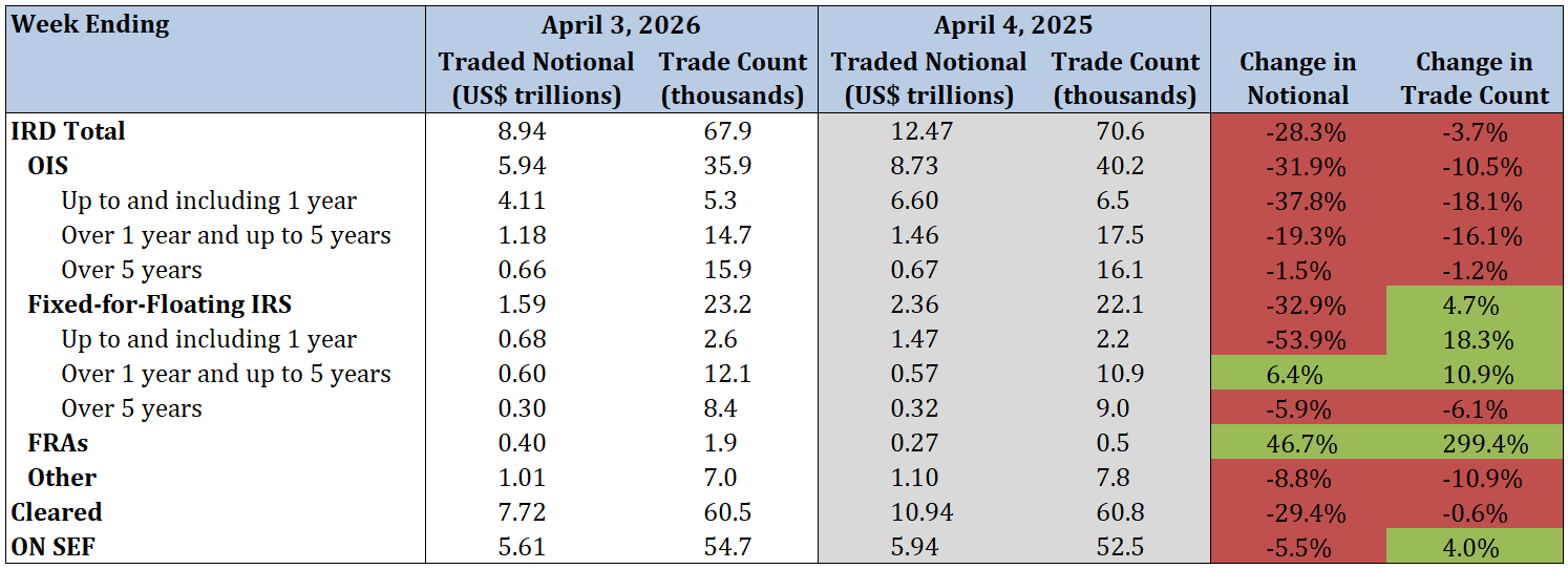 - YTD 2026, 46.0% of fixed-for-floating IRS traded notional had tenors up to and including one year, 35.2% between one and five years, and 18.8% over five years